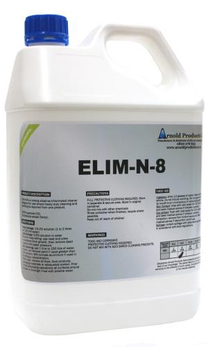 - Elim-N-8 (Elimn8) is a strong alkaline/chlorinated cleaner designed for use where heavy duty cleaning and sanitising is required from one product.